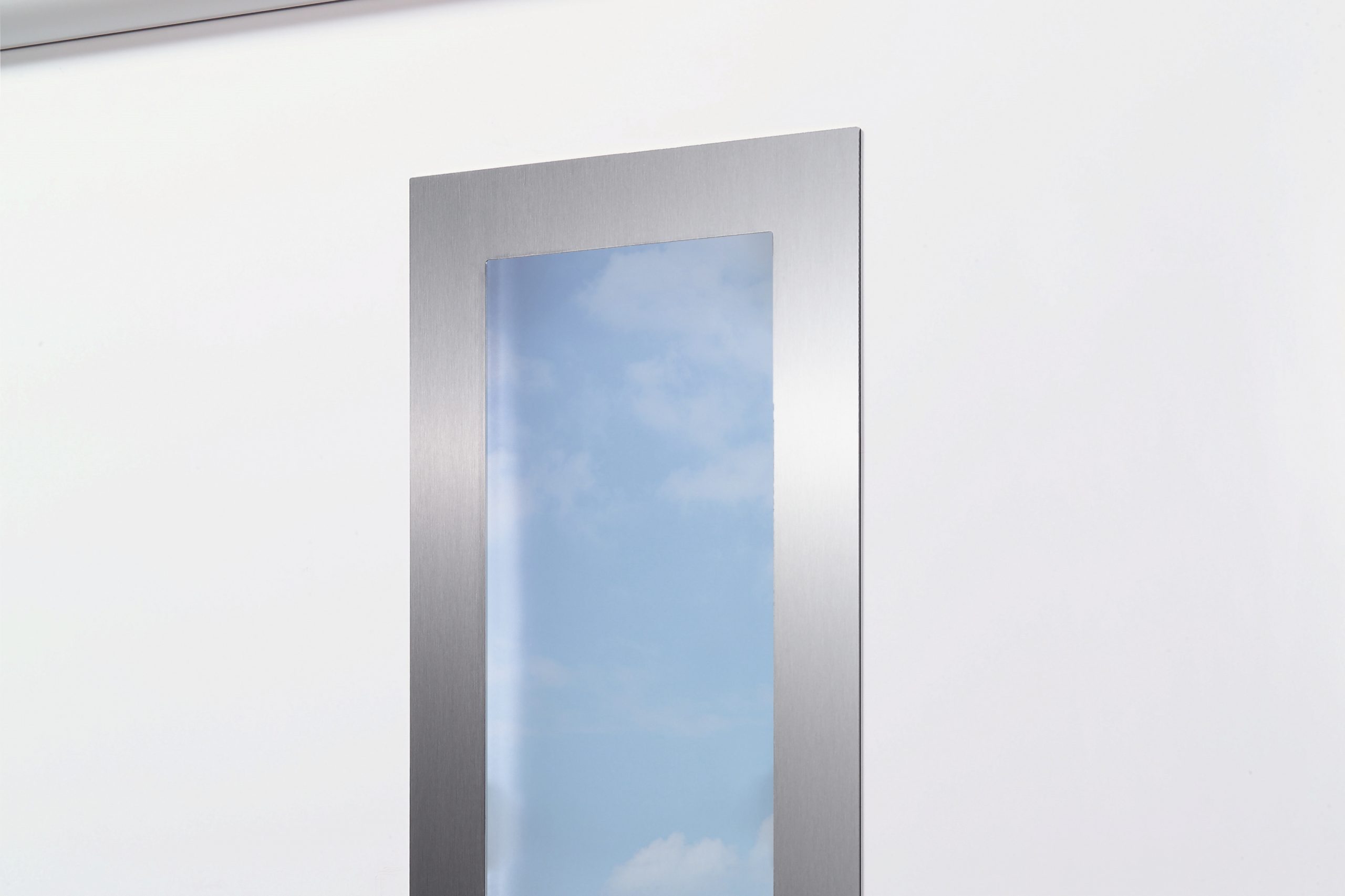 ze stali nierdzewnej. Oferta przeszkleń w drzwiach Themo65 została natomiast uzupełniona o szkło typu „lustro weneckie”. Po jaśniejszej stronie, na przykład na zewnątrz w ciągu dnia, powstaje lustrzane odbicie, dzięki czemu nie jest możliwe zaglądanie do środka.