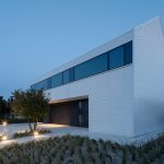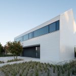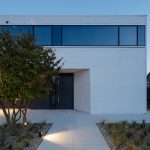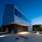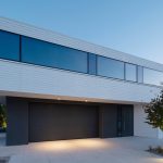 Architekci postawili na czystą, syntetyczną formę, w której dominują proste linie, kontrastujące materiały i spójna paleta barw. Dom składa się z dwóch przenikających się brył – masywnego, grafitowego parteru oraz lekkiego, białego piętra, unoszącego się nad terenem niczym monolit. Od strony ogrodu przestrzeń otwiera się dużymi przeszkleniami, łącząc wnętrze z naturą. Panoramiczne witryny z przesuwnymi skrzydłami zapewniają niezakłócony widok na ogród, który płynnie przechodzi w zielony taras na piętrze.