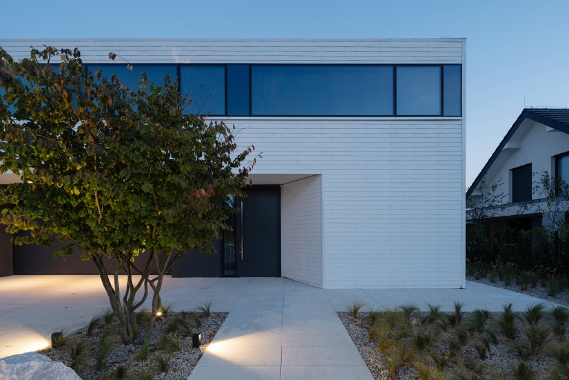 Architekci postawili na czystą, syntetyczną formę, w której dominują proste linie, kontrastujące materiały i spójna paleta barw. Dom składa się z dwóch przenikających się brył – masywnego, grafitowego parteru oraz lekkiego, białego piętra, unoszącego się nad terenem niczym monolit. Od strony ogrodu przestrzeń otwiera się dużymi przeszkleniami, łącząc wnętrze z naturą. Panoramiczne witryny z przesuwnymi skrzydłami zapewniają niezakłócony widok na ogród, który płynnie przechodzi w zielony taras na piętrze.
