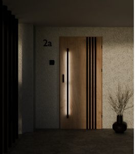 To element, który zachwyca swoją prostotą i elegancją – delikatne światło LED subtelnie podkreśla linię drzwi, tworząc efekt lekkości i nowoczesności. Po zmroku antaba staje się nie tylko ozdobą, ale też praktycznym ułatwieniem – oświetla przestrzeń wejścia, ułatwiając otwieranie drzwi i zapewniając większe bezpieczeństwo.