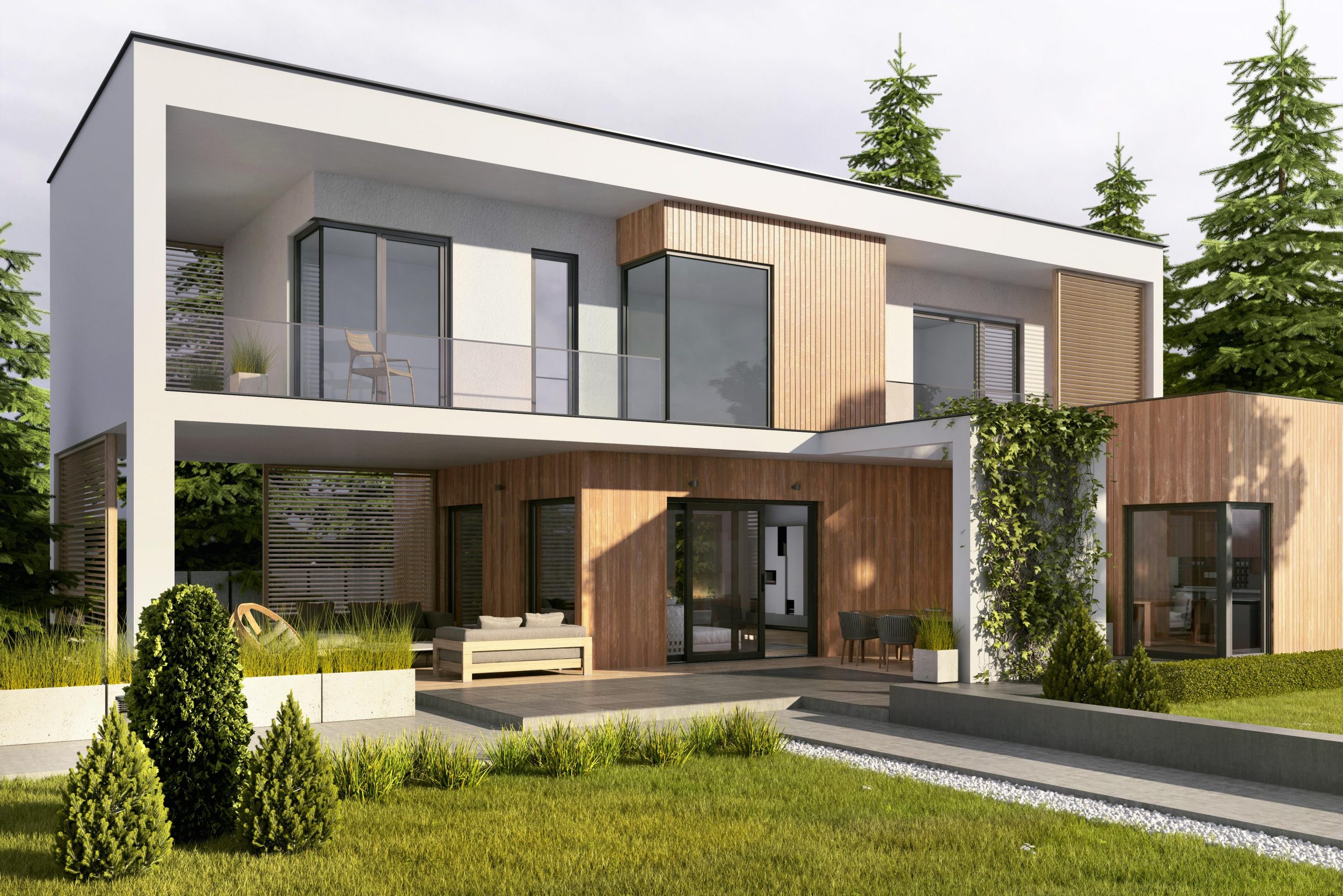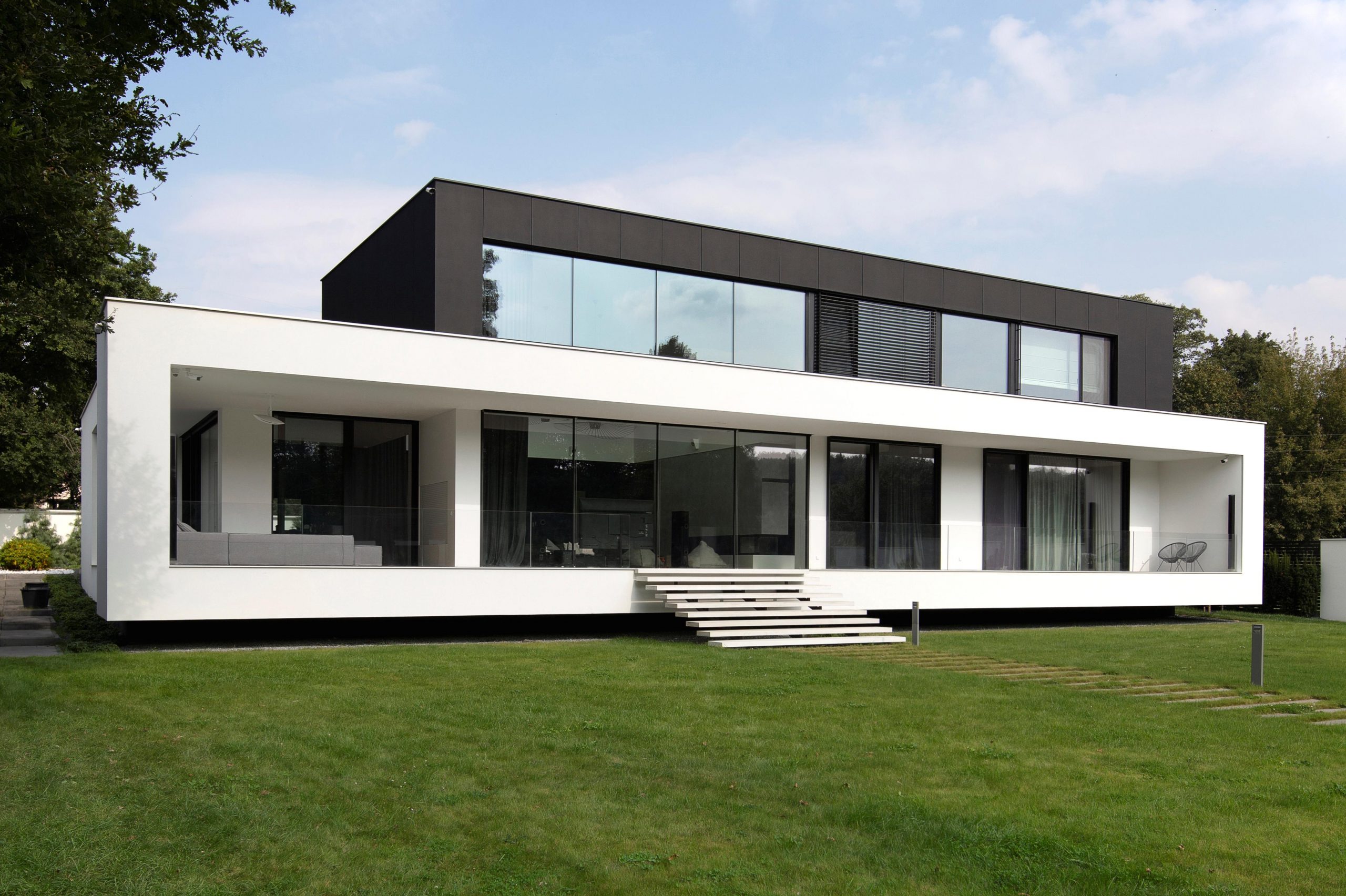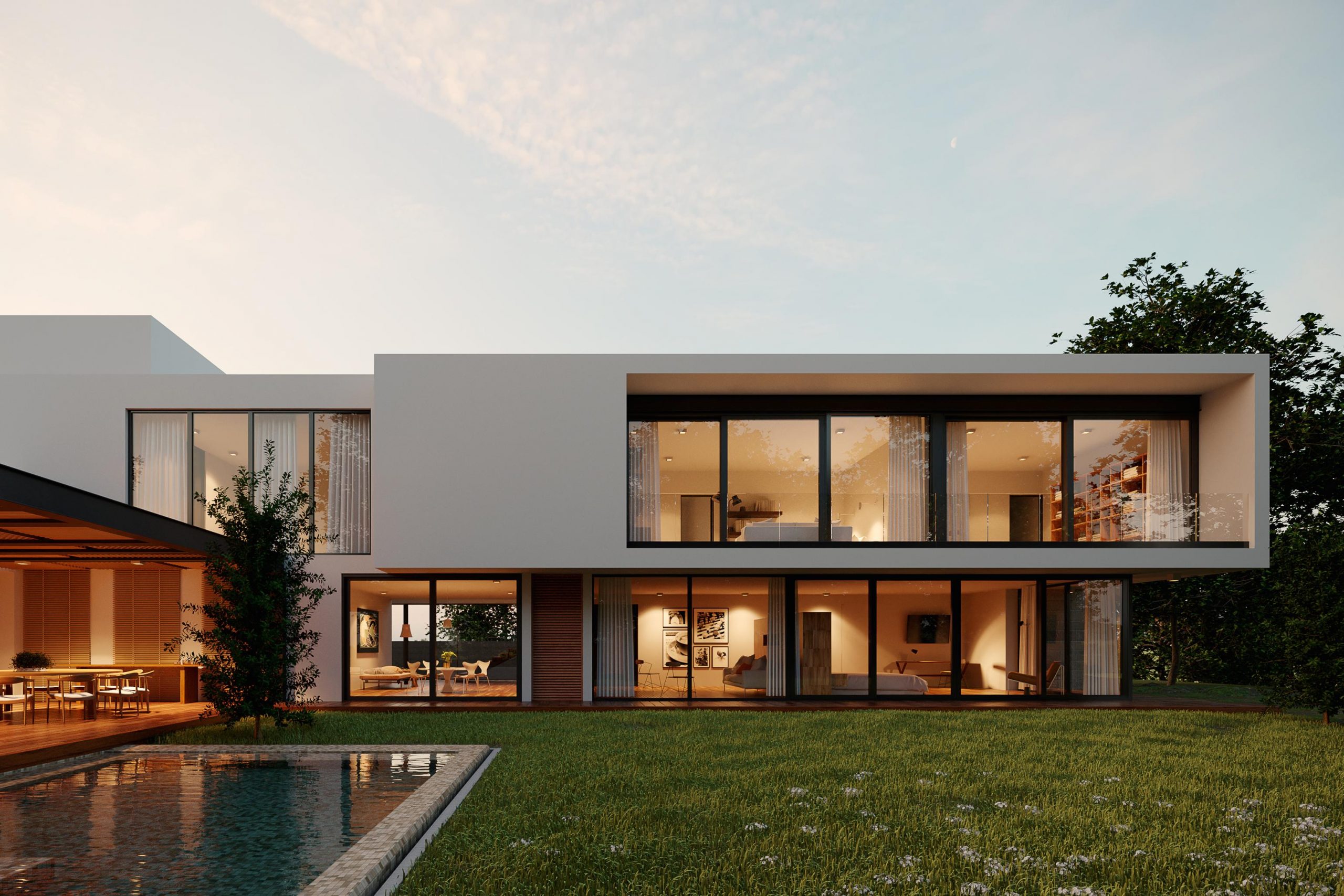 Nowoczesne domy cechuje minimalizm. Ich wyróżnikiem są wielkoformatowe przeszklenia, które dodają budynkom wizualnej lekkości i otwierają wnętrza na otoczenie. Duże okna umieszcza się nie tylko w salonie, ale także w gabinecie, sypialni, kuchni i jadalni. Mogą one przybierać różną formę. Stosowane są przeszklenia panoramiczne zajmujące całą powierzchnię ściany, szklane narożniki, okna pionowe i konstrukcje dwukondygnacyjne. By zmaksymalizować powierzchnię szyb i podkreślić minimalistyczną stylistykę domu, montuje się systemy okienne i tarasowe z węższymi profilami.