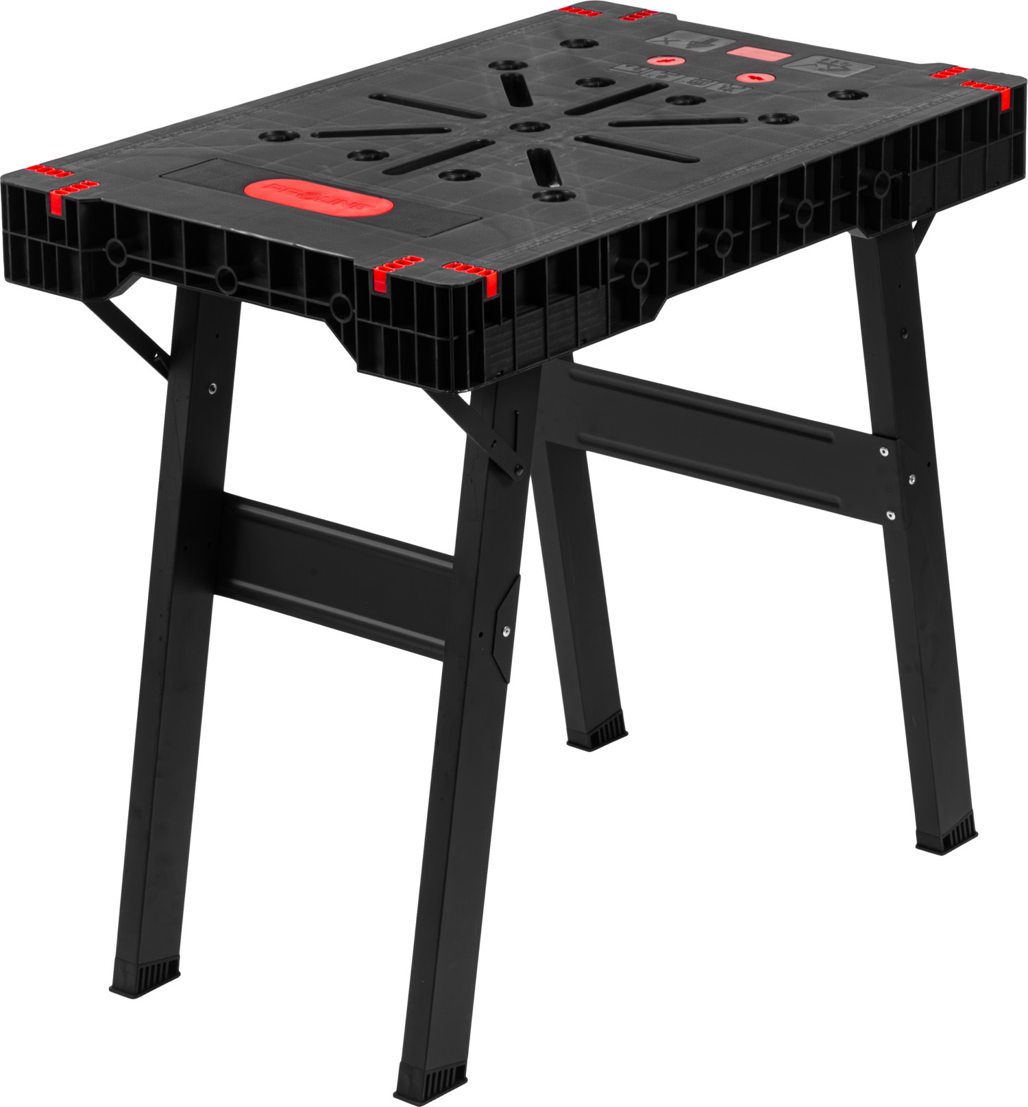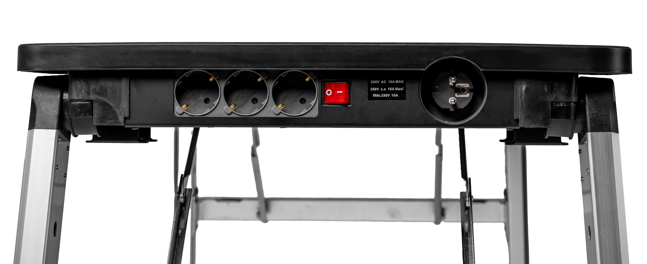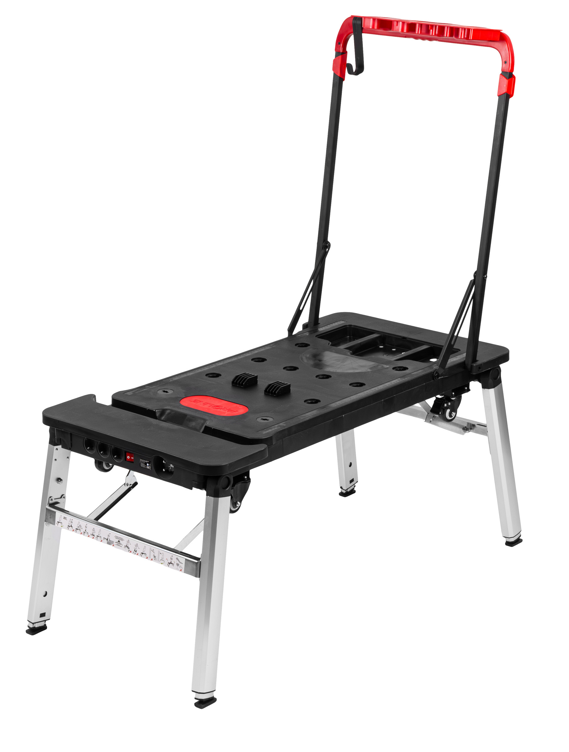 Stół Proline 62001 posiada także gniazda elektryczne, liniał i kątownik. Co ważne, wykonany został on z trwałych materiałów: malowanej proszkowo stali, tworzywa ABS i aluminium. Samopoziomujące nakładki na nogach eliminują kołysanie, co zwiększa bezpieczeństwo i precyzję podczas pracy.