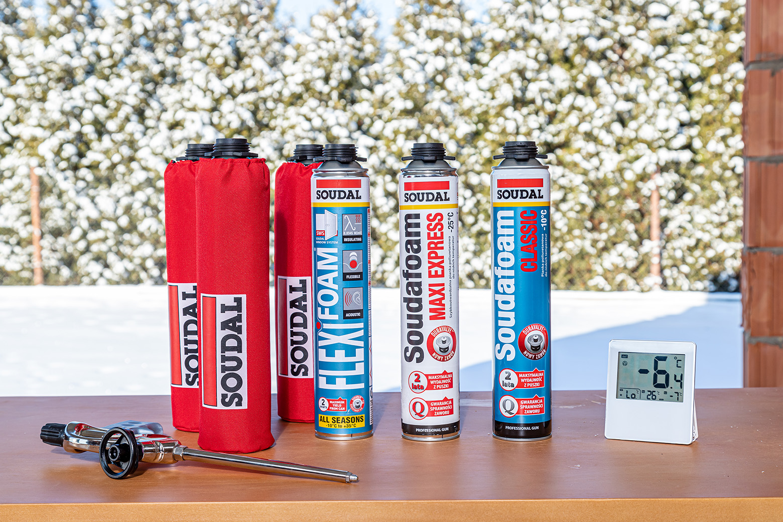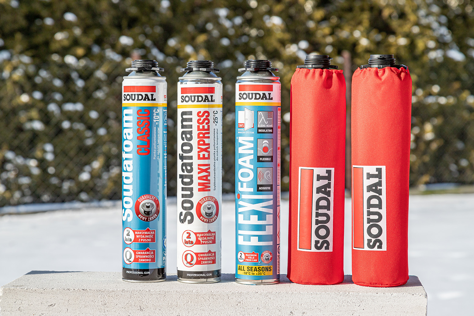Jaką piankę zimową wybrać? Przy montażu wielkogabarytowej, podatnej na odkształcenia stolarki sprawdzi się pianka poliuretanowa Soudafoam Low Expansion o bardzo niskiej rozprężalności i krótkim czasie obróbki, którą można stosować przy temperaturze do -10°C. W skrajnie niskich temperaturach (do –25°C) można natomiast sięgnąć po wysokowydajną piankę Soudafoam Maxi Express –25°C. Dobrym rozwiązaniem do wykorzystania przez cały rok, w przedziale temperatur od –10°C do + 35°C jest zaś bardzo elastyczna, wielosezonowa pianka Flexifoam o najwyższej izolacyjności termiczno-akustycznej.