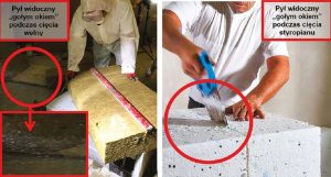 Fot. PSPS: Porównanie emisyjności pyłu podczas docinania (zdjęcia – widoczny pył okiem nieuzbrojonym podczas docinania, po lewej stronie z wełny, po prawej ze styropianu)