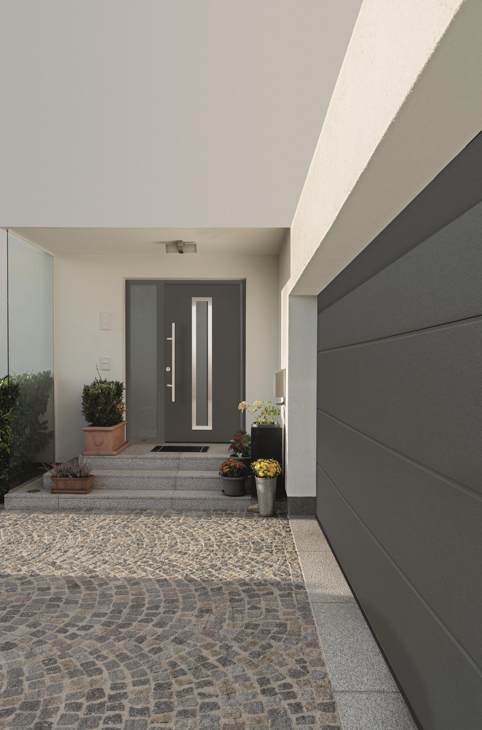 Drzwi Hörmann możemy spersonalizować decydując się np. na okucia w wersji black.edition w kolorze głębokiej czerni, przeszklenia w kolorze czarnym lub wykonanie drzwi w tym samym kolorze, co brama garażowa RenoMatic, która również dostępna jest w promocji.