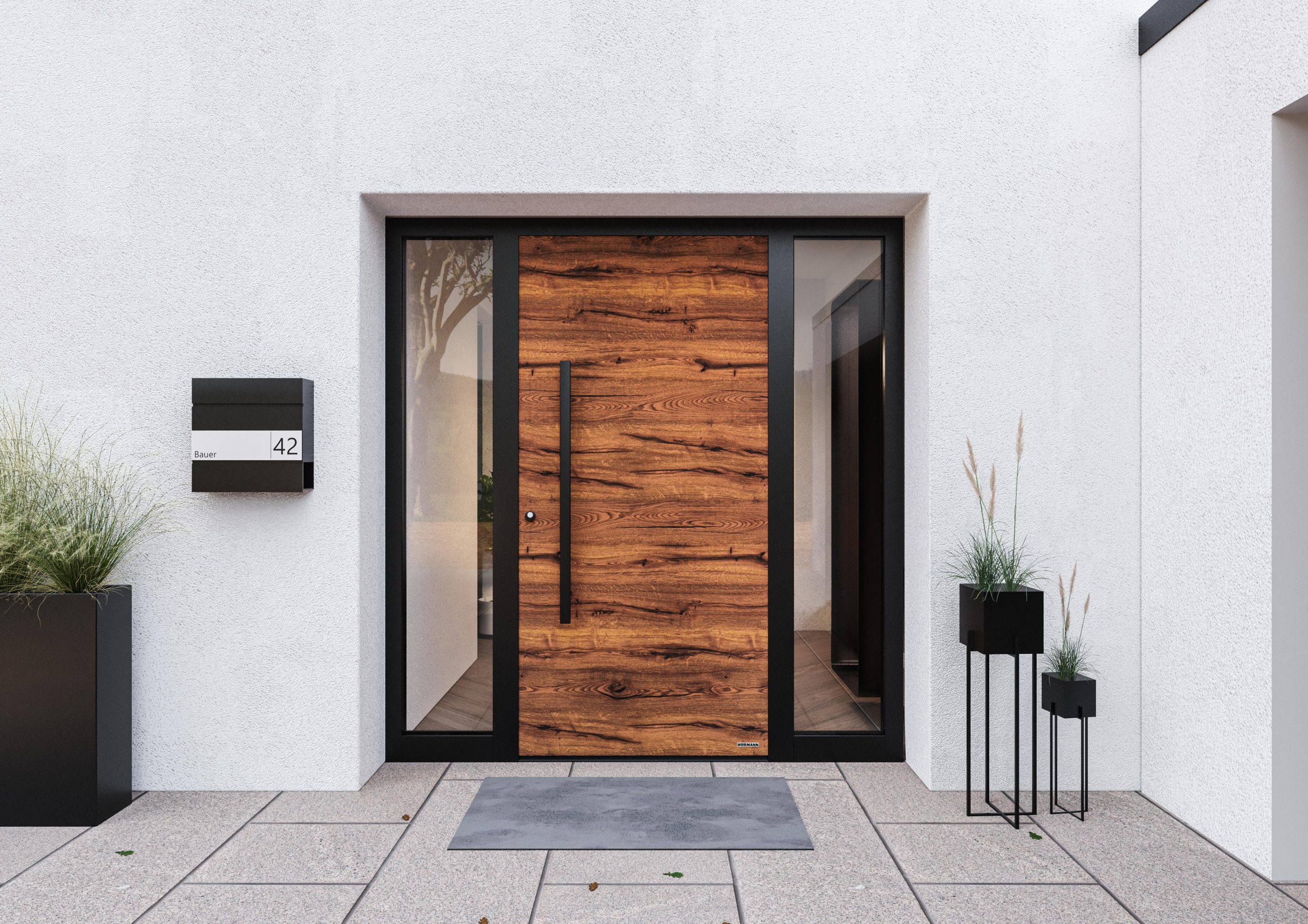 Drzwi ThermoSafe Decoral, wzór 860, powierzchnia Attic Wood, ościeżnica w kolorze RAL 9005, opcjonalne elementy boczne